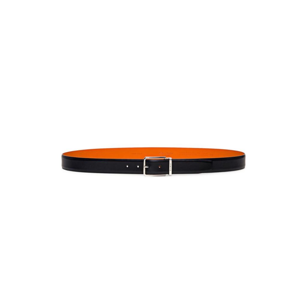 Enhance your smart wardrobe with this luxurious men’s belt, dedicated to special occasions. This accessory is crafted from hand-polished leather, elevated with an orange leather reverse and a metal loop with engraved lettering. An understated square buckle completes the design.