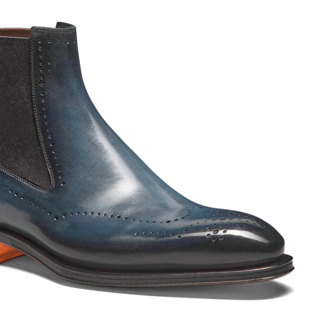 Combining classic elegance with modern allure, this Chelsea boot is an emblem of Santoni’s contemporary craftsmanship. Its fine leather construction showcases the radiant allure of our signature “velatura” gradated finish. Quintessential brogue detailing is reinterpreted through a modern lens to bring a sophisticated touch to its otherwise classic design, while a Goodyear welt construction ensures optimal resistance.