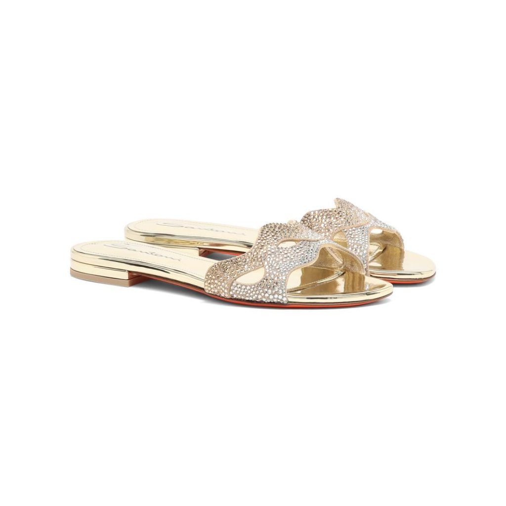 Elevate your summer style with these stunning flat sandals that combine elegant details with all-day comfort. The metallic leather design features sparkling crystal accents, wrapping your foot in sophisticated wavy bands for a glamorous look. The contrast leather sole showcases the vibrant appeal of our signature Arancio Santoni finish.
